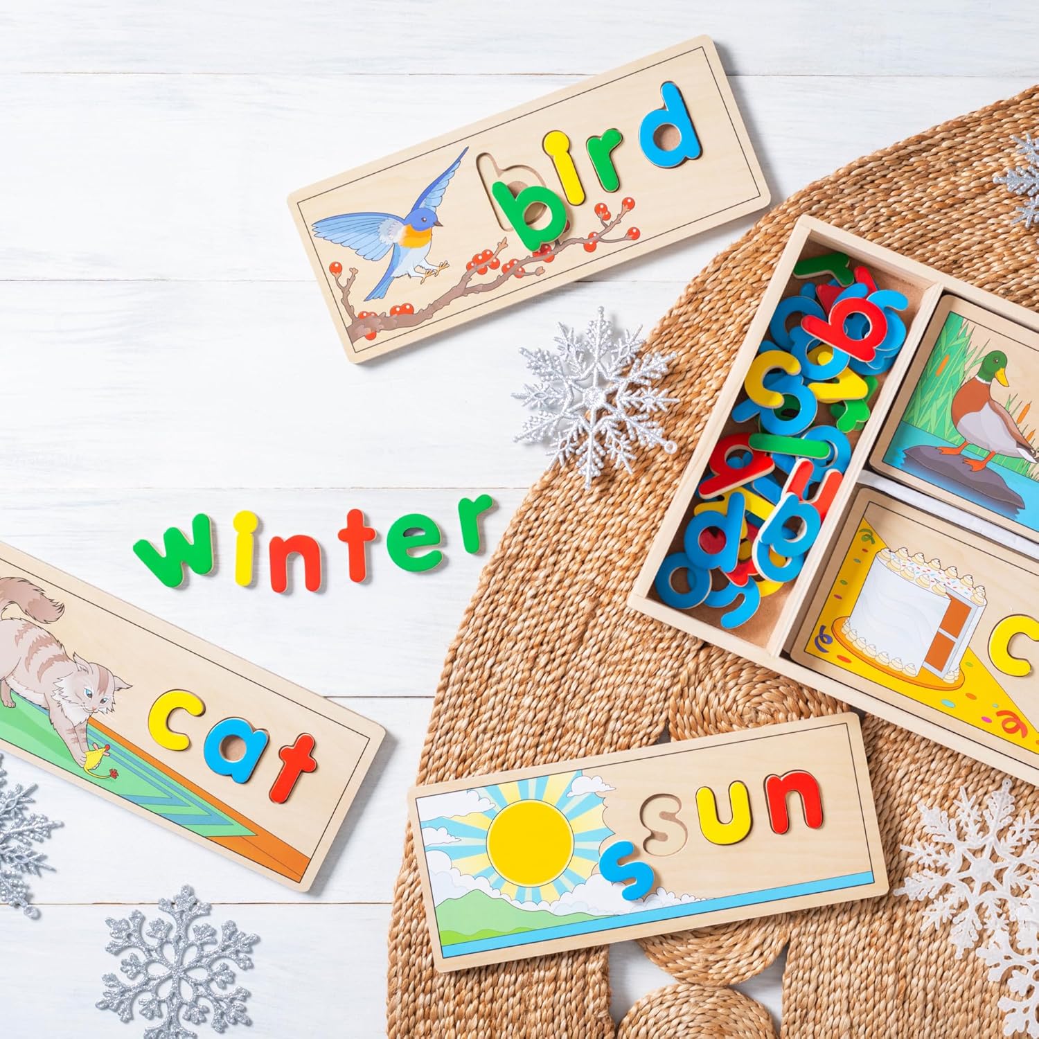The Melissa & Doug See & Spell learning toy is a 50+ piece colorful wooden puzzle with easy-to-handle letters that fit into 8 two-sided cutout boards to spell 3- and 4-letter words